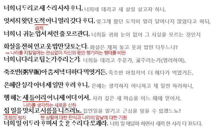 이는 당시 조선 사회를 비유적으로 표현한 것으로 건국 후 태평성대를 누리다보니 나태해지고 서로 이익만을 추구하던 당시의 조선 사회 벼슬아치들이 임진왜란을 겪은 후에도 나라를 재건하기보다는 여전히 자신들의 이익만 따지는 모습을 비판하며 사려깊은 새로운 신하의 출현을 기대하는 것으로 볼 수 있습니다.