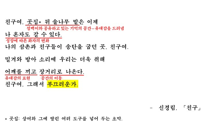 "친구여, 그래서 부끄러운가" 이는 4연에서 말한 부끄러운가가 반복된 것으로 결코 지금 친구에게 아픔이 된 것들이 부끄러워할 것이 아니는 위로로 말할 수 있습니다.
