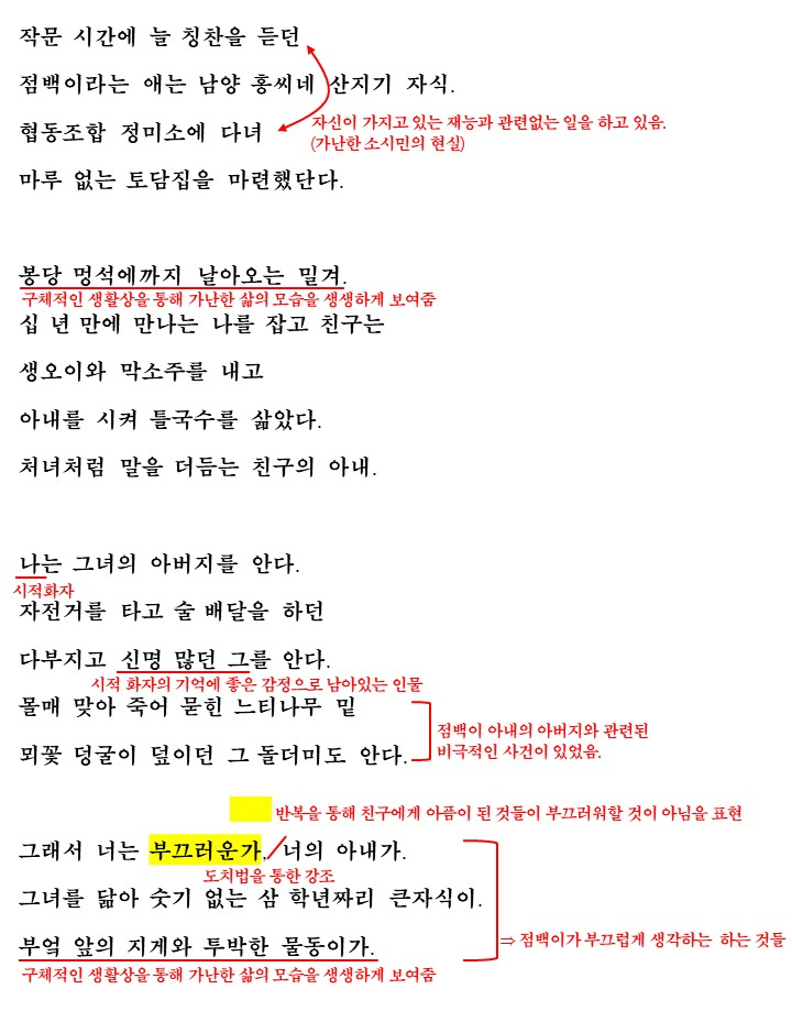 십 년 만에 만난 화자를 감고 생오이와 막소주를 내오는 잠백이 그의 집은 붕당 멍석에까지 밀겨가 날아올 정도로 좋지 않은 환경입니다. 화자는 구체적인 생활상을 통해 가난한 삶의 모습을 생생하게 보여주고 있는 것이죠. 그리고 점백이의 아내에 대한 이야기가 나오는데 그의 아내는 처녀처럼 말을 더듬습니다.(무언가 부족한 느낌이 있죠.)