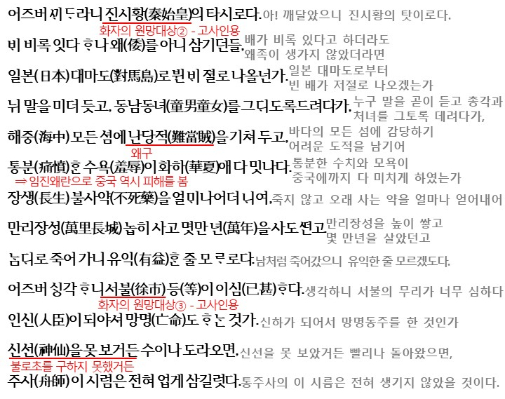 그 다음에는 진시황과 서불을 원망합니다. 진시황이 불로초를 구하러 신하들을 다방면으로 보냈고 이 때 일본으로가 돌아오지 않은 신하들이 자손을 낳고 살아 왜적이 되었다고 원망합니다. 이후 서불(불로초를 구하러 일본으로 간 진시황의 신하)을 원망합다. 신하된 도리로 불로초를 못구했다면 돌아왔어야 하지만 그는 돌아오지 않고 그곳에서 정착해 그의 자손들이 왜적이 되었다는 것이죠. 이런 원망은 고사를 인용한 것으로 선상탄 전반적으로 고사인용의 기법이 많이 쓰입니다.
