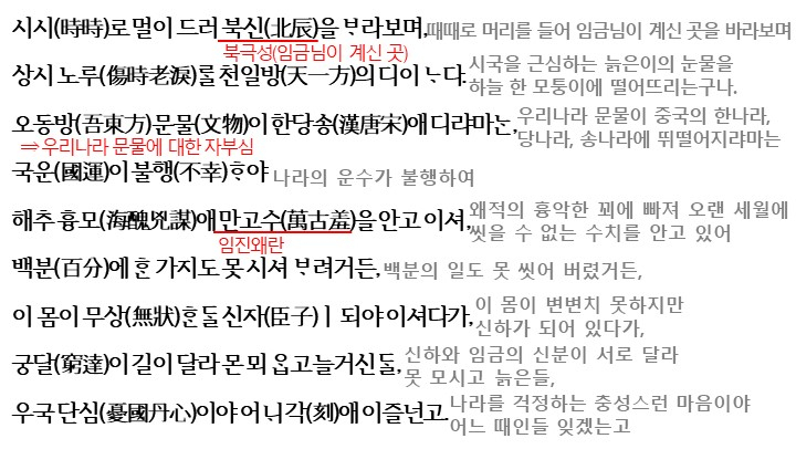 그리고 임금을 걱정하며 우리나라에 대한 자부심과 왜적에게 침략당한 것에 대한 분함을 나타냅니다.