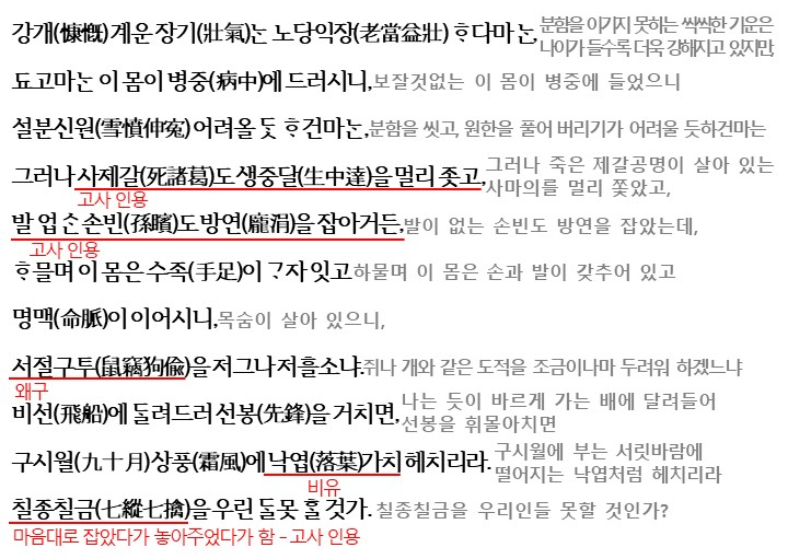 그리고 이러한 분함을 자신이 늙어 갚아주기 어려울 듯하다고 말하면서도 제갈공명이 죽은 후 자신의 목상을 통해 살아있는 사마의를 패퇴시키고 발 없는 손빈이 계책을 써서 방연을 죽인 고사를 인용하여 왜적들을 무찌를 수 있다는 무인의 기개를 보여줍니다.