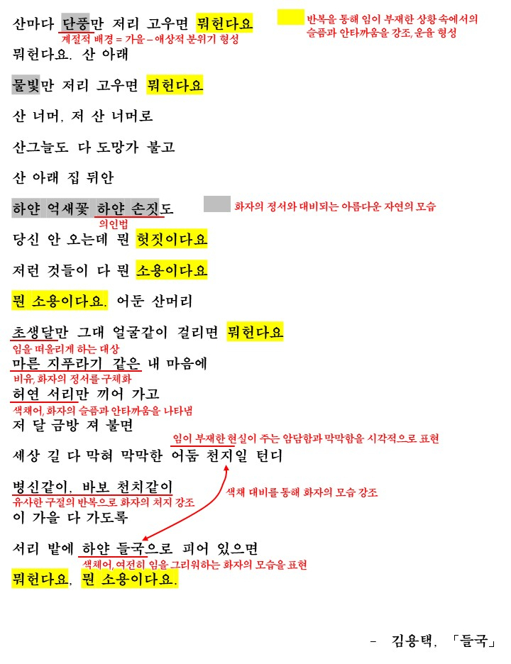 이러한 다양한 자연물을 통해 화자의 정서를 효과적으로 드러내고 반복을 통해 효율적으로 표현하고 있습니다.