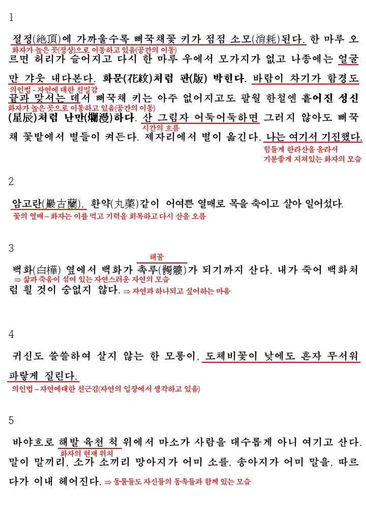 그리고 9연에서 정말 맑고 깨끗한 백록담에 도달하여 몰아의 경지를 느끼는 것으로 마무리됩니다. 이 때 9연에서 화자의 쓸쓸함과 깨다 졸다 기도마져 잊었더니라라는 표현이 아오는 데 이를 구체적으로 해석하려면 당시 시대상황에 대한 정확한 <보기>가 나와야하니 일단은 있는 그대로를 보고 문제를 풀 때 <보기>가 나오면 이를 해석 기준으로 삼아서 해석하면 되겠습니다.