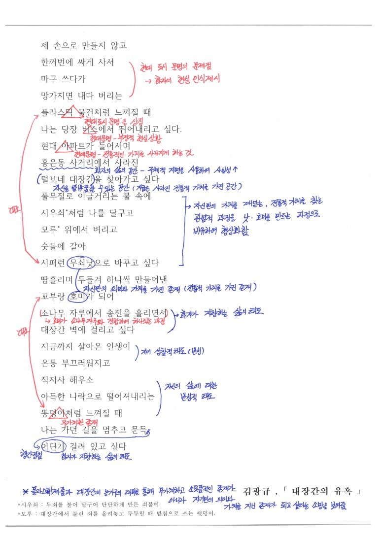이를 시인은 플라스틱과 대장간의 물건들의 대비를 통해 효과적으로 드러내고 있습니다.