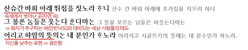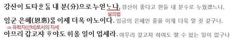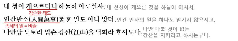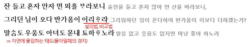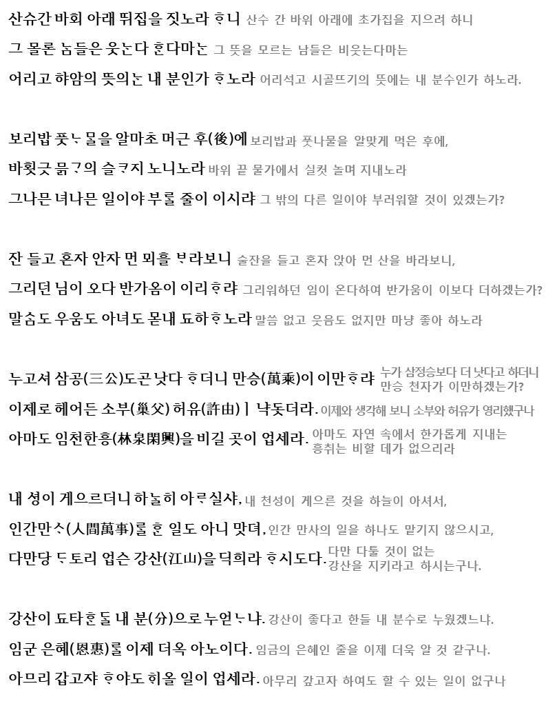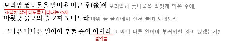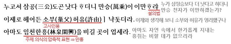 이렇게 제1~5수에서 자연에서 한가롭게 지내며 흥겨워하는 삶의 모습을 보여주며 제6수에서 임금을 찬양하는 유학자적인 태도를 보여주며 '자연 속에서 살아가는 즐거움'을 노래한 만흥은 마무리합니다. 그리고 이러한 내용들을 표기된 것과 같이 비교법과 설의법을 통해 강조하고 있습니다.