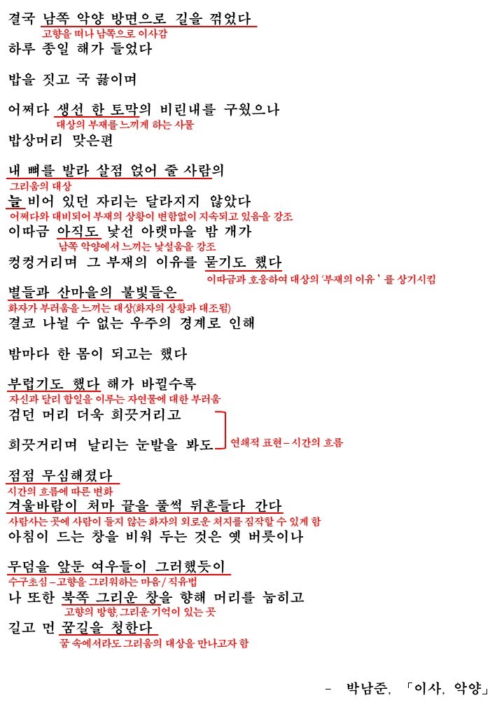 화자가 이사를 간 이유는 무엇일까요? 시의 전체적인 내용을 참고할 때 아마 소중한 사람의 죽음때문이 아닐까 합니다. 아마도 그래서 화자는 정든 고향을 떠나 결국 남쪽 악양 방면으로 이사를 갑니다.