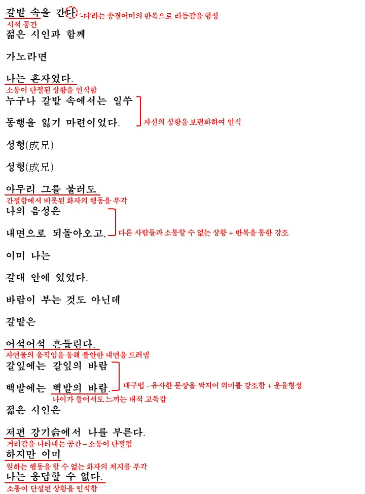 화자는 젊은 시인과 함께 갈밭속을 갑니다. 가다보면 어느새 화자는 혼자가 되는데 이는 소통이 단절된 상황을 의미합니다. 이 상황에서 화자는 '누구나 갈밭 속에서 일쑤 동행을 잃기 마련이다'라며 자신의 상황을 보편화하여 인식합니다.