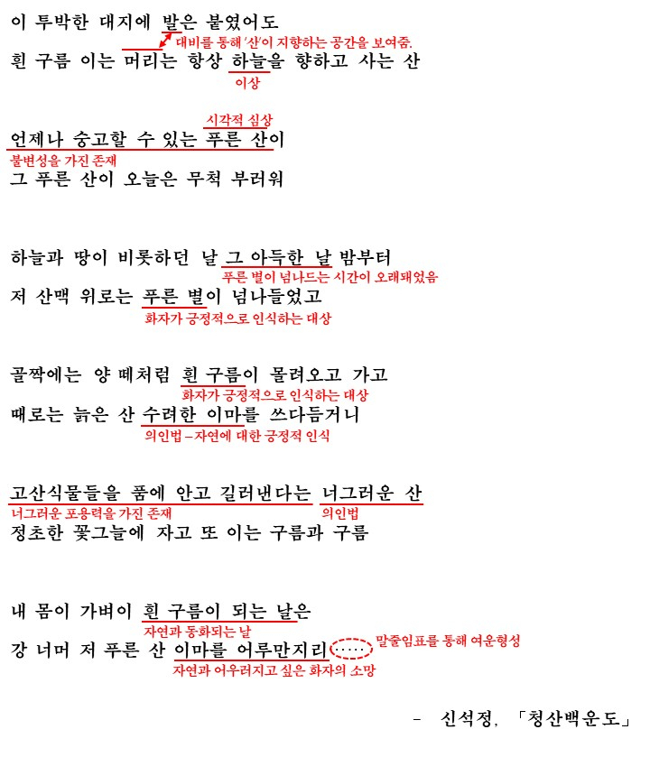 그러면서 화자는 산을 불변성(언제나 숭고할 수 있는 푸른 산)과 포용력(고산식물들을 품에 안고 길러낸다는 너그러운 산) 존재로 표현합니다. 이러한 산을 마치 사람과 같이 표현(의인법)하여 예찬하고 푸른산과 흰구름의 색채(시각적심상)를 통해 긍정적인 인식을 드러내며 자신이 구름이 되어 푸른 산을 어루만지는 자연과 어우러지고 싶어하는 소망을 드러냅니다.