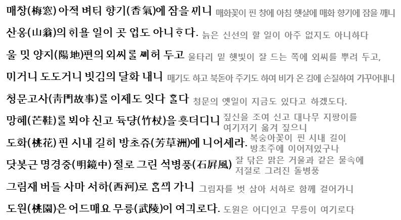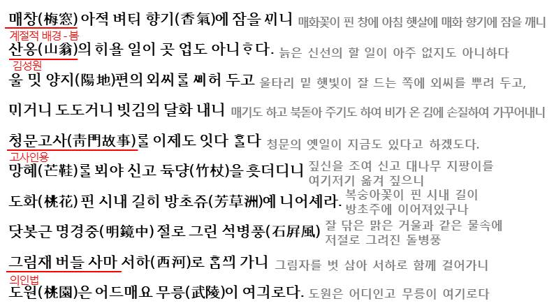 성산별곡의 본사는 성산의 봄-여름-가을-겨울을 이야기하는데요. 그 중 봄 부분입니다. 봄의 성산의 매화향기 풍기는 모습으로 시작해 김성원이 밖으로 나와 밭일을 하는 것을 청문고사(한나라 때 소평이 청문 밖에서 오이를 심었다는 이야기)를 이야기 하며 그의 생황을 말합니다. 그리고 복숭아꽃 핀 시내길의 아름다움을 말하며 이 곳이 무릉이라 하며 성산의 아름다운 봄 풍경을 표현합니다.