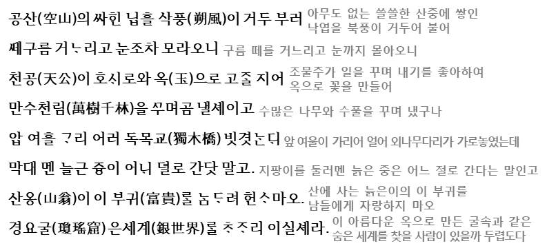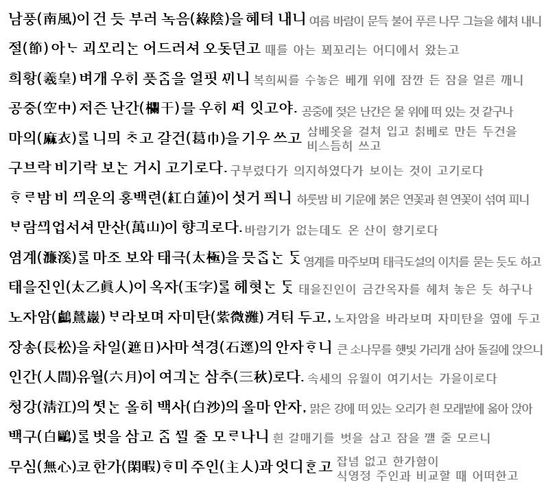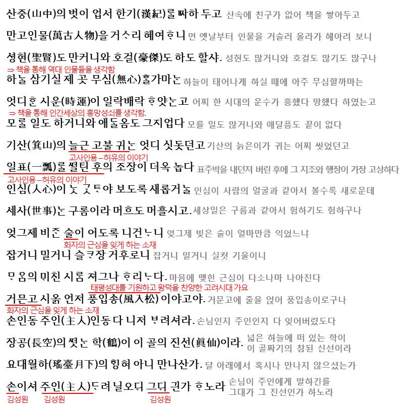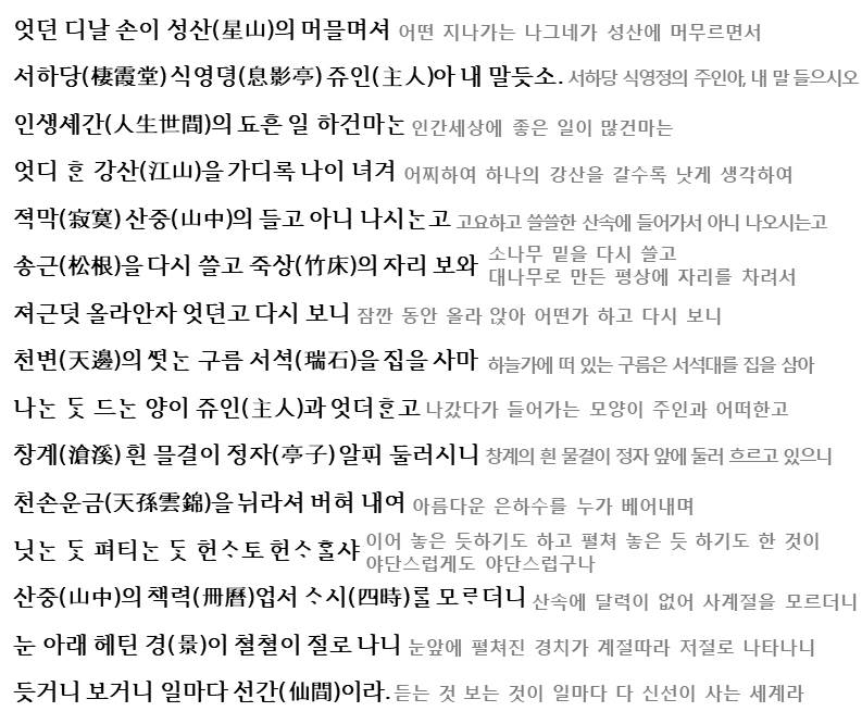성산별곡의 결사부분입니다. 화자는 독서를 통해 옛 인물을 생각하며 인간 세상의 흥망성쇠에 대해 떠올리고 무상감에 젖습니다. 잠시 근심한듯 하지만 술과 거문고를 통해 이 근심을 잊고 무아지경에 빠집니다. 그리고 이런 신선과 같은 전원생활의 즐거움. 이러한 즐거움을 누리는 식영정의 주인(김성원)을 대화체를 사용하여 칭송합니다.
