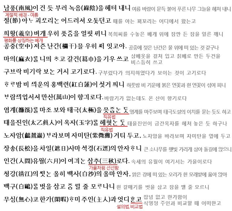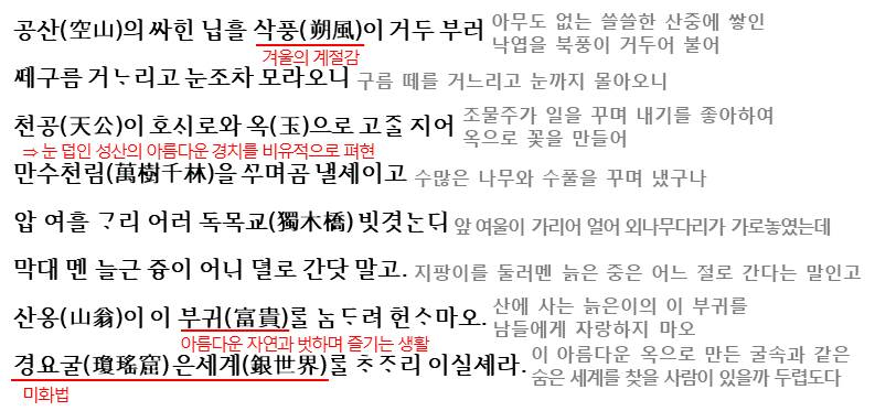 이렇게 해서 성산별곡에서는 '성산의 사계절 풍경과 식영정 주인 김성원의 신선과 같은 풍류 생활을 예찬'하고 있습니다.