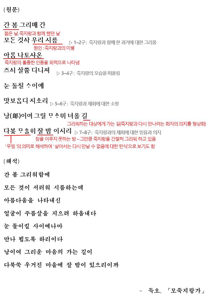 이렇게 모죽지랑가는 '죽지랑에 대한 추모와 재회에 대한 소망'을 노래하고 있습니다.
