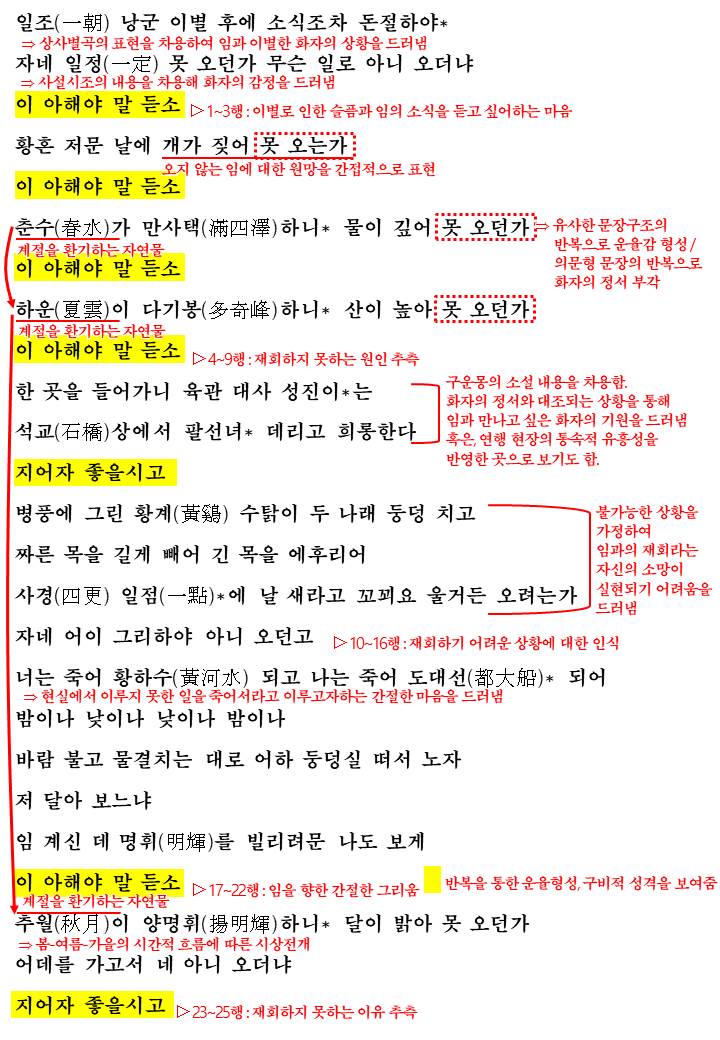 이러한 내용들을 조합해 작품에서는 이별로 인한 슬픔과 임의 소식을 듣고 싶어하는 마음을 노래한 후 재회하지 못한 원인을 추축하며 임에 대해 간접적으로 원망(개가 짖어 못오는가) 재회하지 못한 상황에 대해 인식하기도 합니다.