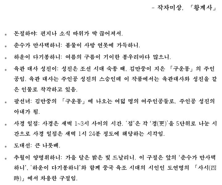⁎ 육관 대사 성진이: 성진은 조선 시대 숙종 때, 김만중이 지은 「구운몽」의 주인공임. 육관 대사는 주인공 성진의 스승인데 이 작품에서는 육관대사와 성진을 같은 인물로 착각하고 있음.