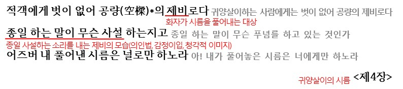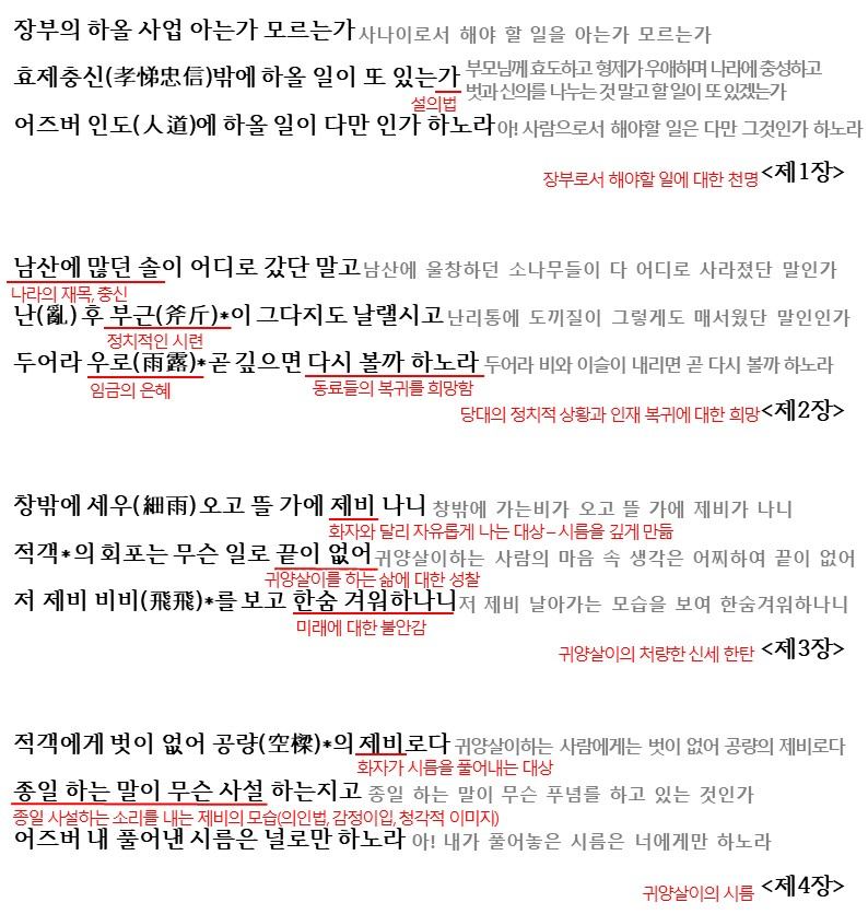 4장에서는 귀양살이의 시름이 드러나는데요. 4장에서의 제비는 3장과는 다르고 화자가 시름을 플어내는 대상으로 화자는 이 제비에게 감정이입을 해 자신의 시름을 표현합니다.
