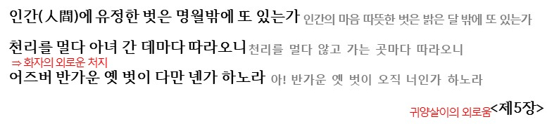 5장에서는 귀양살이를 하는 화자의 외로운 처지가 드러납니다. 명월 밖에 벗이 없다고 표현하며 천리를 멀다 않고 가는 것은 명월뿐이라며 반가운 옛 벗이 오직 명월 뿐이라고 하지만 이는 역으로 화자가 그만큼 외로운 처지임을 보여주고 있습니다.