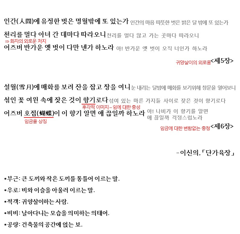 이렇게 해서 이 작품은 ‘귀양살이의 고달픔과 임금에 대한 변함없는 충정’을 드러내고 있습니다. 그럼 이제 해설을 다시보며 학습을 마무리해보도록 합시다.