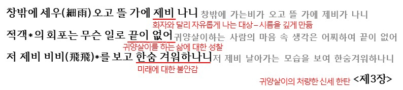 3장에서는 귀양살이의 처량한 신세 한탄이 드러납니다. 귀양지에서 자유롭지 못한 화자와 달리 자유롭게 나는 제비를 보며 화자는 시련이 깊어가고 자신의 삶에 대해 성찰하며 날라가는 제비를 보며 한숨지으며 미래에 대한 불안감을 드러냅니다.