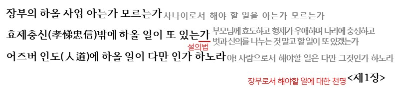 1장에서는 장부로서 해야할 일에 대해 청명하는 부분이 나옵니다. 장부의 호올 사업 아는가 모르는가의 물음을 통해 자신이 한 일이 당연히 해야할 일임이라는 당위성을 드러내고 있습니다. 또한 이는 작가의 충직했던 삶의 태도가 드러나는 것으로 ‘효제충신’ 즉, 부모에 대한 효도, 형제 사이의 우애, 임금에 대한 충정, 벗 사이의 신뢰를 강조하며 이를 중요시하는 태도를 보여줍니다.