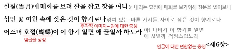 6장에서는 임금에 대한 변함없는 충정이 드러납니다. 매화는 지조와 충성을 드러내는데요. 매화를 보러 창문을 열어본다는 것은 자신의 충정을 드러내는 것으로 볼 수 있습니다. 거기에 잦는 것이 향기고 강한 지조와 충절을 드러내고 있습니다. 그러면서 호접(임금)이 이 향기를 알며 괴로울까 걱정하며 임금에 대한 변함없는 충정을 강조하며 작품이 마무리합니다.