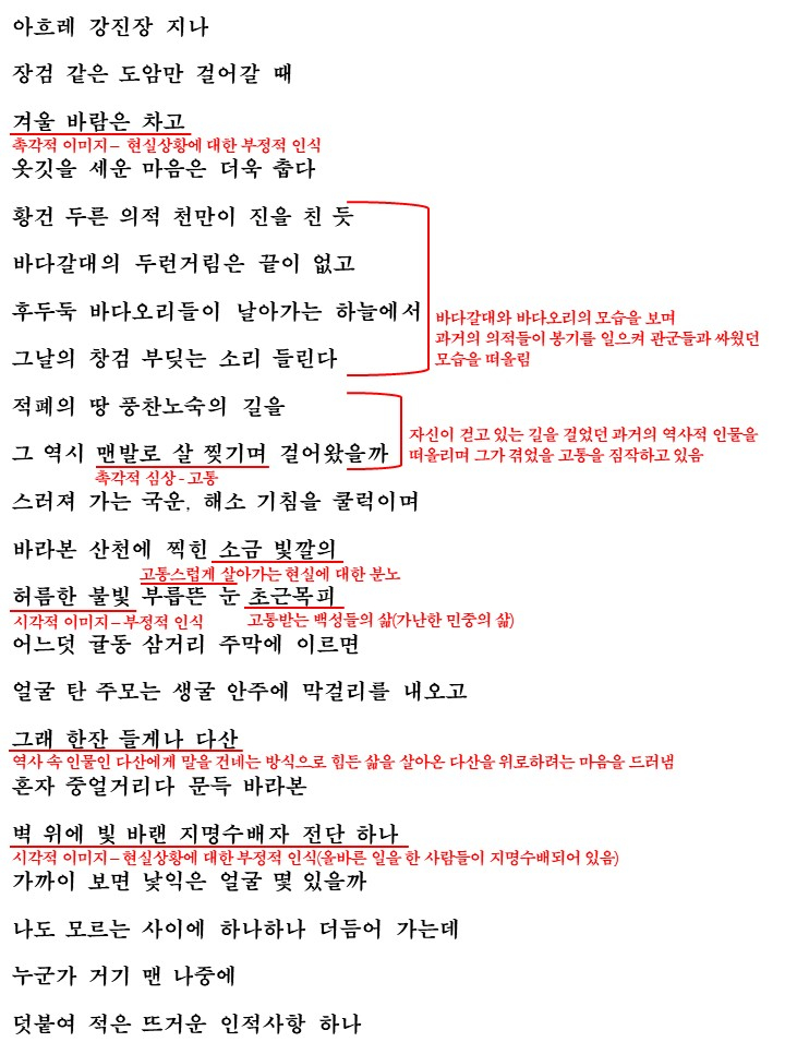 화자는 간진장, 도암만을 지나고 있습니다. 그런데 그 곳에서 부정적인 지뱅층에 항거한 의적들의 창검소리가 들리는 듯한 느낌(황건 두른 의적천~)을 받습니다. 그리고 자신이 걷고 있는 길을 걸었던 역사적 인물을 떠올리며(적폐의 땅 풍찬노숙의 길~) 그가 겪을 고통에 대해 상상하며 주막을 향해 걸어갑니다.
