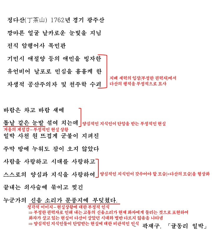 이렇게 해서 이 시는 "다산의 삶을 통해 바라본 부정적 현실 인식"을 나타내고 있으며 이를 다양한 감각적이미지와 함께 과거의 일들을 현재의 상황에 자연스럽게 연결시켜 표현하고 있습니다.