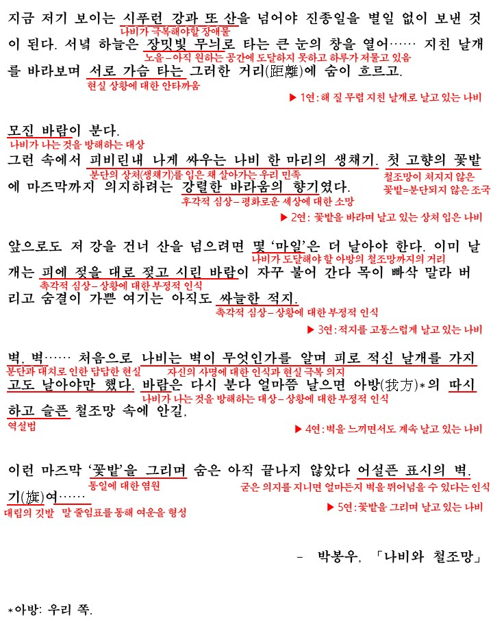 이렇게 해서 이 시는 대립되는 성격의 시어들을 바탕으로 나비의 이동(비행)을 통해 시상을 전개하며 다양한 감각적 심상을 통해 상황을 효과적으로 드러내고 있습니다. 그렇게 '민족 분단의 아픔과 통일에 대한 열망'을 노래하고 있는 것이죠.