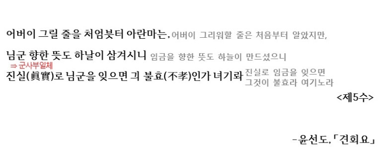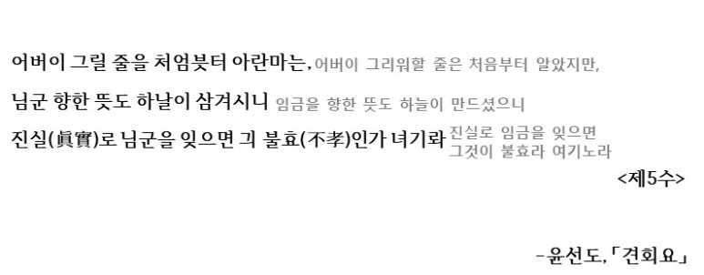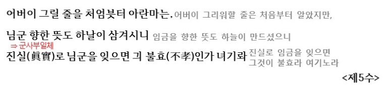 5수에서는 4수에서 부모에 대한 그리움을 드러낸 것을 임금을 향한 충정과 연관시켜 부모 자식 사이의 정과 마찬가지로 임금과 신하의 관계도 하늘이 정해 준 것임을 나타내며 임금에 대한 충정을 나타냅니다. 그렇게 해서 충과 효의 일치에 대한 꺠달음을 드러냅니다.