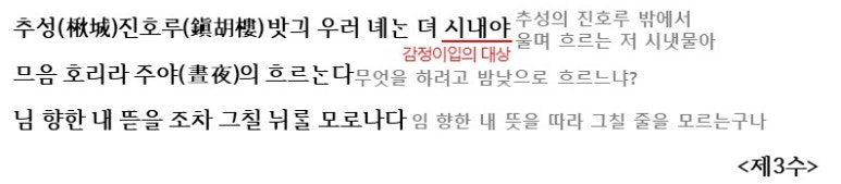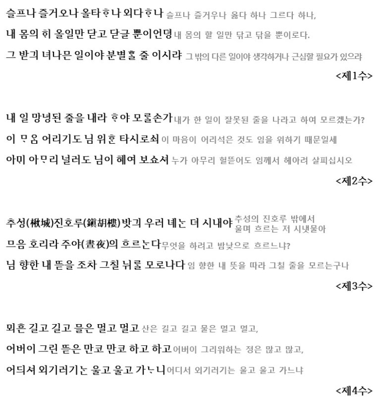 임금을 향한 변함없는 충성심을 노래하고 있습니다. 시냇물에 감정을 이입해서 자신 역시 그 와 같이 임을 향한 일편단심이 그칠 지를 모른다며 충성심을 노래하고 있습니다.