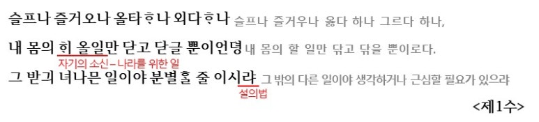 먼저 1수에서는 화자의 강직한 성품이 드러납니다. 어떤 상태이든지 자신의 소신을 지키고 자신이 할 일만 갈고 닦으며 그 밖의 일이야 생각하지 않는다는 그의 신념이 드러납니다. 그야말로 신념에 충실한 삶을 보여주는 부분입니다.