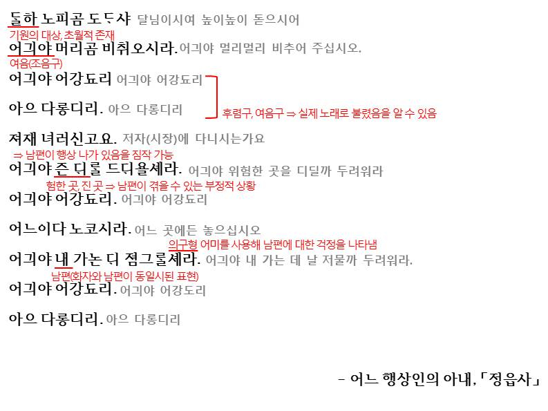 이런 배경설화에서 알 수 있 듯 이 작품은 행상을 떠난 후 돌아오지 않는 남편에 대한 걱정이 드러나 있습니다. 그럼 이제 작품을 읽은 후 해석을 통해 학습해보도록 합시다.