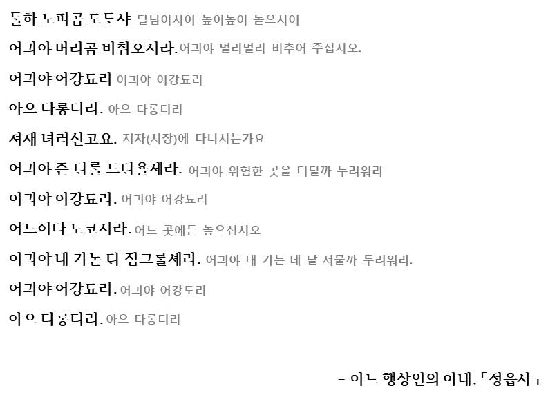 이번에 다룰 작품은 어느 행상인의 아내가 지었다고 전해지는 '정읍사'입니다. 여느 고대가요가 그렇듯 정읍사에도 배경설화가 있는데요. 정읍사의 배경설화는 아래와 같습니다.