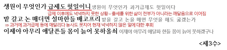 제3수에서는 한탄의 원인이 구체화 됩니다. 화자는 생원이 무엇인가 급제도 헛일이라고하는 데요. 이는 급제 이후에도 넉넉하지 못한 상황에서 연유되는 것으로 출세를 위한 삶이 전부가 아니라는 깨달음으로 이어집니다. 그래서 화자는 젊어서 밭을 갈고 논을 매었다면 무엇을 해도 지금 굶겠는가라고 생각하지만 이제는 늙어서 애달파한들 일하지 못하는 것에 대해 한탄합니다.