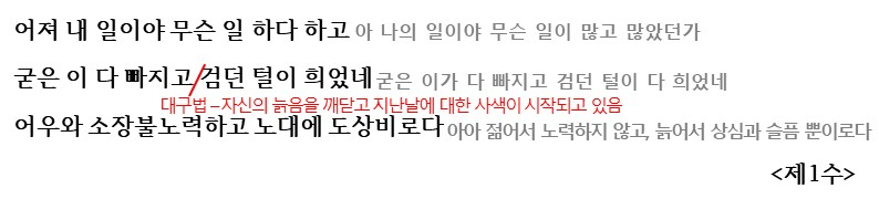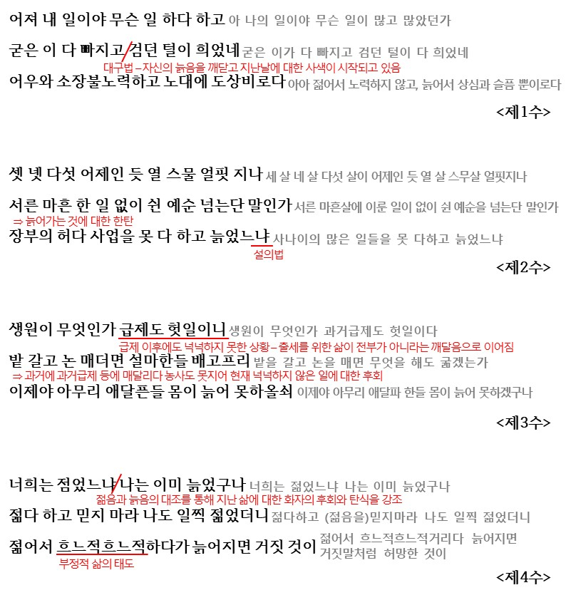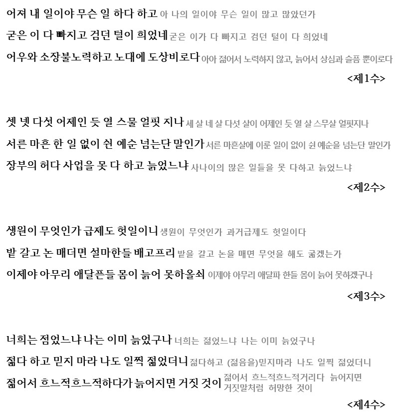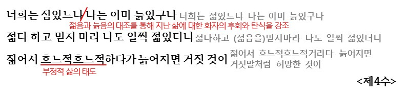 제4수에서는 젊은 이들에게 전달하려는 화자의 마음이 드러납니다. 너희의 젊음과 자신의 늙음을 대조하며 젊음을 흐느적흐느적 거리리다 늙어지면 허망하다며 젊은들을 향한 경고가 드러납니다.