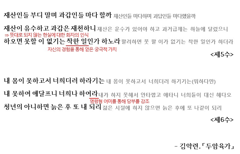 이번에 다룰 작품은 김약련의 '두암육가'입니다. 이 작품은 하얗게 센 머리를 보며 자신의 지난 삶에 대한 한탄과 젊은이들에게 전해줄 말을 이야기한 작품인데요. 총 6수로 된 작품을 보면서 화자는 자신의 지난 날에서 어떠한 일을 후회하며 젊은이들에게 어떤 가치를 전달하려하는지에 대해 생각하며 작품을 감상하고 해설을 통해 학습해보도록 합시다.