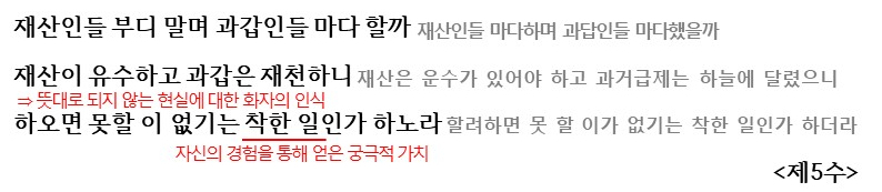 제5수에서는 세상에서 흔히 명성이라고 부는 것들에 대한 화자의 인식이 드러납니다. 화자는 재산도 과답도 마다하지 않았지만 현재는 가지고 있지 않습니다. 이를 통해 화자는 현실은 뜻대로 되지 않고 재산은 운수가 있어야 하고 과거급제는 하늘에 달렸다고 생각하고 있는 것이죠. 그래서 못할 이없이 할 수 있는 것. 누구나 의지를 가지면 할 수 있는착한 일에 가치를 두고 말합니다.