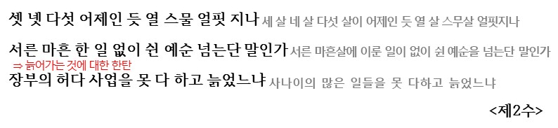 제2수에서는 화자가 한일 없이 늙어갔다고 생각하며 한탄하는 모습이 나옵니다. 1연에서 부터 이어진 한탄의 원인은 종장의 '장부의 허다 사업을 못 다하고 늙었느냐'에서 나타나는데요. 이는 일을 다 못하고 늙었다는 표현으로 설의법으로 볼 수 있습니다. 결국 화자는 사나이로서 할 일을 다 못하고 늙어서 이렇게 한탄하는 것으로 볼 수 있습니다.