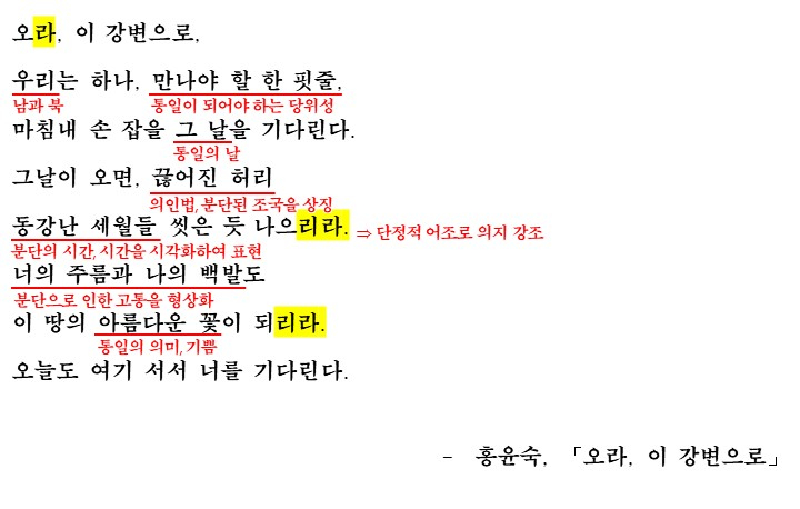 이 번에 다룰 시 '오라, 이 강변으로'는 대상에 대한 간절한 그리움을 나타내고 있습니다. 보통의 시의 경우 내제적으로 의미를 파악하고 외적인 의미를 더해 해석하지만 이 시 같은 경우 '남과 북의 상황'을 염두에 두고 시를 읽은 후 해석을 통해 학습해보도록 합시다.