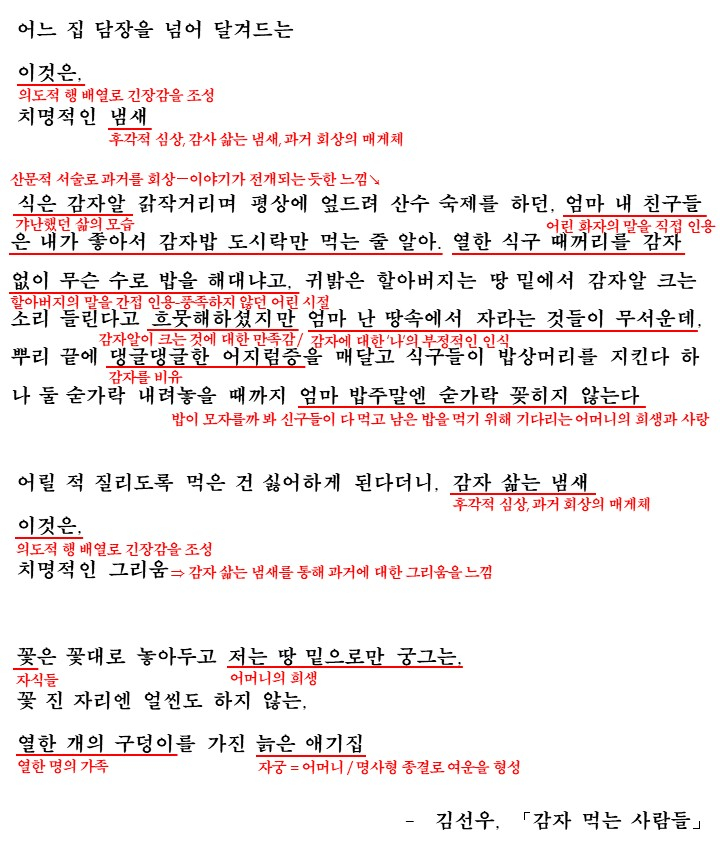 화자의 과거는 산문적 서술로 이야기가 전개되는 듯한 느낌을 주고 인물들의 말을 직 간접적으로 인용하여 현실감을 줍니다. 과거 화자의 가족은 감자라도 밥에 섞지 않으면 11명이나 되는 식구들이 먹기 힘들었기에 감자를 밥에 섞어 감자밥을 도시락에 싸줬고 할아버지는 식구들을 먹이는 감자들이 크는 것이 좋았지만 화자는 감자밥이 부끄러웠습니다. 그래서 화자는 감자에 대해 부정적인 태도를 지니고 있던 것이죠. 그런 도중에도 어머니는 식구들의 밥이 모자를까 봐 식구들이 밥을 다 먹을 때까지 기다리는 희생적인 모습을 보여줬습니다.