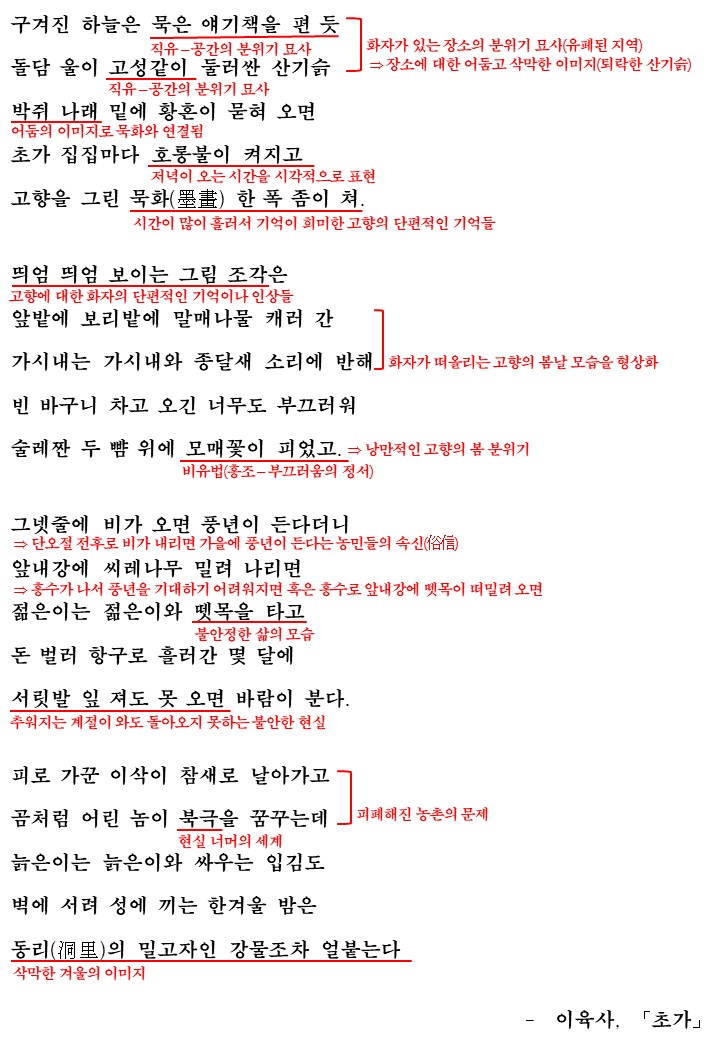 이번에 다룰 작품은 이육사의 '초가'입니다. 이 작품은 발표 당시 '유폐된 지역에서'라고 창작 장소를 밝힌 시로 작가는 이곳에서 오래전 떠나온 고향을 떠올려 시로 형상화 하고 있습니다. 시 속에서 떠올린 고향의 모습이 어떤지에 대해 생각하며 작품을 감상하고 해석을 통해 학습해보도록 합시다.