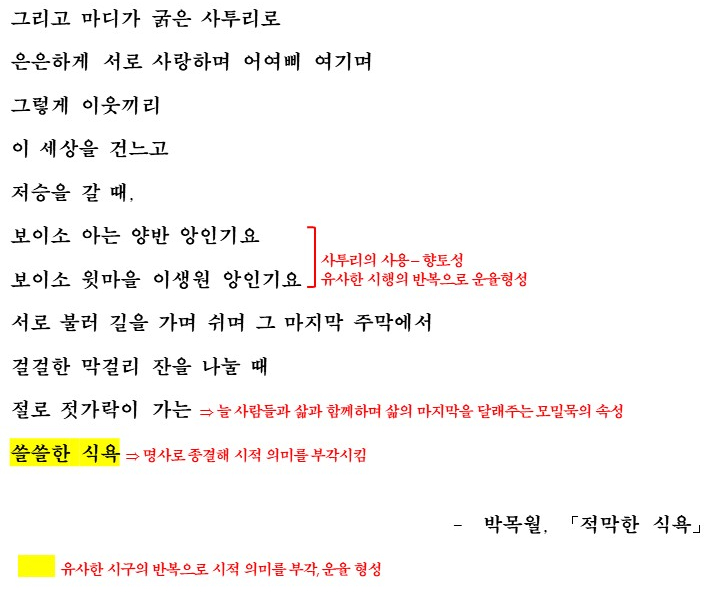 이렇게 이 시는 모밀묵을 매개로 하여 '인생의 허전함과 쓸쓸함을 달래고 싶은 마음'을 드러내는데요. 이를 모밀묵을 매개로 형상화된 삶의 모습을 떠올리는 방식으로 나타내며 유사한 시구(쓸쓸한 식욕, 쓸쓸한 식성-모밀묵은 이러한 쓸쓸함을 달래주는 소재)의 반복을 통해 의미를 부각합니다. 또한 명사로 시행을 종결하여 시적 대상의 의미를 부각하기도 합니다.