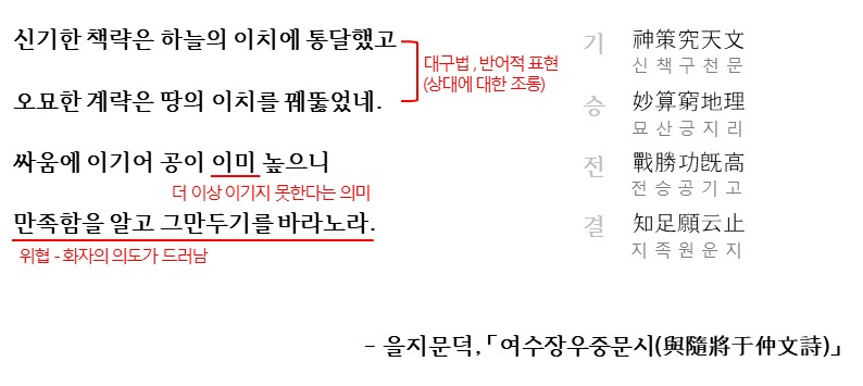 작품의 시작을 보면 마치 우중문을 칭찬하는 것 같은 느낌입니다. 신기한 책략은 하늘의 이치에 통달했고 오며한 계락은 땅의 이치를 꿰뚫었네라는 대구적인 표현을 통해 우중문을 천문과 지리에 능통한 장군임을 칭찬하는 것 같은 느낌입니다. 허나 배경설화를 볼때 실은 우중문의 계책은 간파하고 있다는 자신감의 표현이자 조롱하는 반어적인 표현으로 볼 수 있습니다. 3구에서는 이러한 자신감이 더욱 드러나는데요. 공이 '이미'높다는 표현을 통해 그동안의 일곱번의 패배는 유도작전이었으며 더 이상의 승리는 불가능하단 것을 암시하며 4구에선 노자의 <<도덕경>>에 있는 '만족함을 알면 욕되지 않고 그칠 줄 알면 위태롭지 않다'라는 구절을 인용해서 전쟁을 그만 끝내자고 권유하는 듯하며서 그만두지 않을 경우 가만 두지 않겠다는 경고와 위협의 의도를 숨겨 드러냅니다.