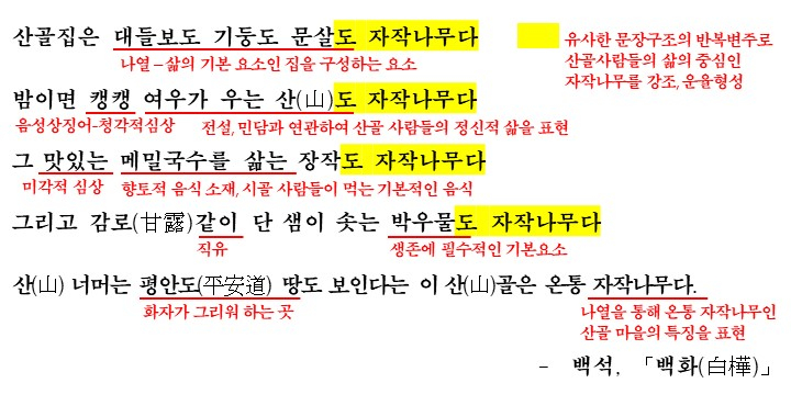 짦은 이 시를 보면 1행부터 4행까지 ~도 자작나무다라는 구조가 반복되며 반주되고 있는데요. 이를 통해 산 속 사람들의 모든 생활의 요소 - 집(대들보, 기둥, 문살), 정신적 요소(여우가 우는 산-전설 설화와 관련), 음식(메밀국수), 물(박우물) - 가 모두 자작나무에 둘러쌓여져있음을 보여주고 있으며 마지막 5행에서 이를 집약해 이 산골이 모두 자작나무임을 나타내고 있습니다.