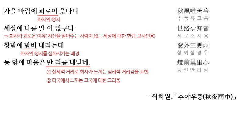 이번에 다룰 작품은 신라말기의 문장가 최치원이 쓴 5언 절구의 한시 '추야우중'입니다. 제목 그대로 가을 밤 비가 내리는 가운데에 화자가 느낀 정서를 표현한 한시인데요. 화자는 어떤 정서를 느끼고 있는지 왜 그러한지를 생각하며 시를 읽은 후 해석을 통해 알아보도록 합시다.