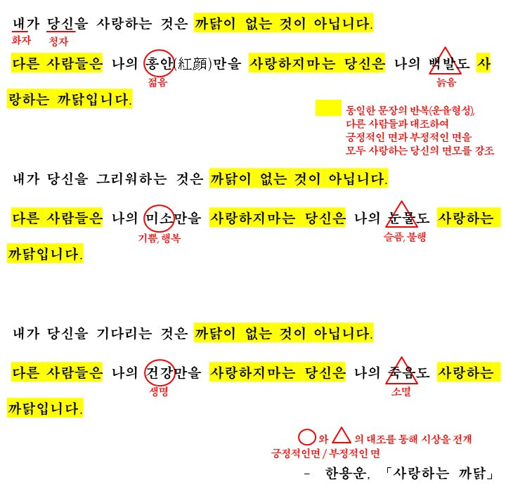 1~3연에서 '내가 당신을 ~하는 것은 다른 사람들은 나의 ~만을 사랑하지마는 당신은 나의 ~도 사앟나는 까닥입니다'며 동일한 문장구조를 반복하는데 이러한 반복을 통해 운율을 형성함과 동시에 당신을 사랑하는 이유를 강조하고 있습니다. 또한 긍정과 부정적인 의미의 대조 구조를 가진 문장을 반복함으로서 다른 사람들과 다르게 부정적으로 생각할 수 있는 부분도 사랑해주는 당신의 모습을 강조하고 잇습니다.
