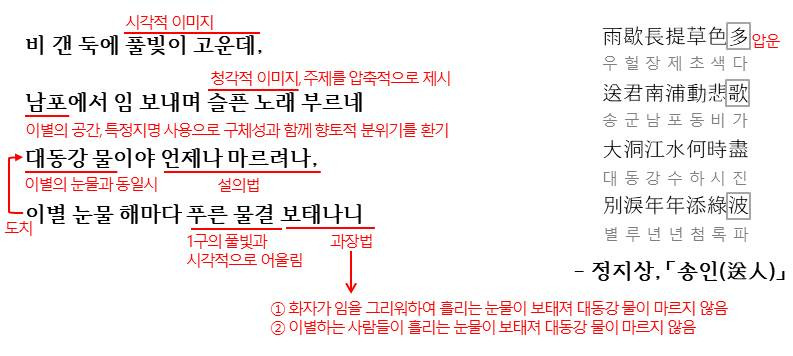 처음에는 항구의 긴 둑에 비에 씻긴 풀들의 푸른빛이 더욱 짙어지는 아름다운 풍경이 제시됩니다. 이와 대조적으로 화자는 임을 보내며 슬픈 이별의 노래를 부르고 있고 아름다운 자연의 풍경과 화자의 슬픈이 이별이 대조되어 이별의 슬픔이 더욱 효과적으로 전달됩니다. 그리고 해마다 이별의 눈물이 푸른 물결에 더해져 대동강 물이 마르지 않는 다는 말을 통해 대동광 물결과 이별의 눈물을 동일시하여 슬픔의 깊이를 더하며, 과장된 표현(사실 흘린 눈물이 더해져도 대동강 물결에 얼마나 영향을 미치겠습니까)으로 이별의 정한을 효과적으로 표현하고 있습니다. 그리고 이를 도치법으로 더욱 강조하고 있는 것이죠.