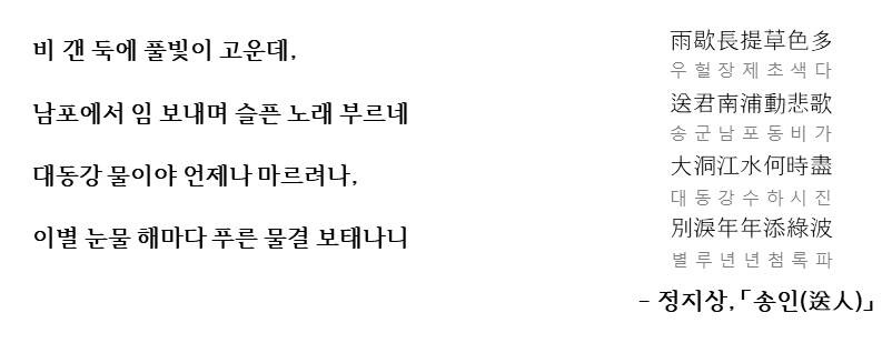이번에 다룰 작품은 우리나라 한시 중 이별가의 백미로 불리는 정지상의 '송인'입니다. 송인은 제목 그대로 '사람을 떠나보내는' 내용을 담은 7언 절구의 한시로 자연의 모습과 인간의 모습이 절묘하게 어우러져서 이별의 슬픔을 전달하고 있습니다. 자연의 모습과 인간의 모습이 어떻게 어우러지는지 보면서 작품을 감상한 후 해석을 통해 학습해보도록 합시다.
