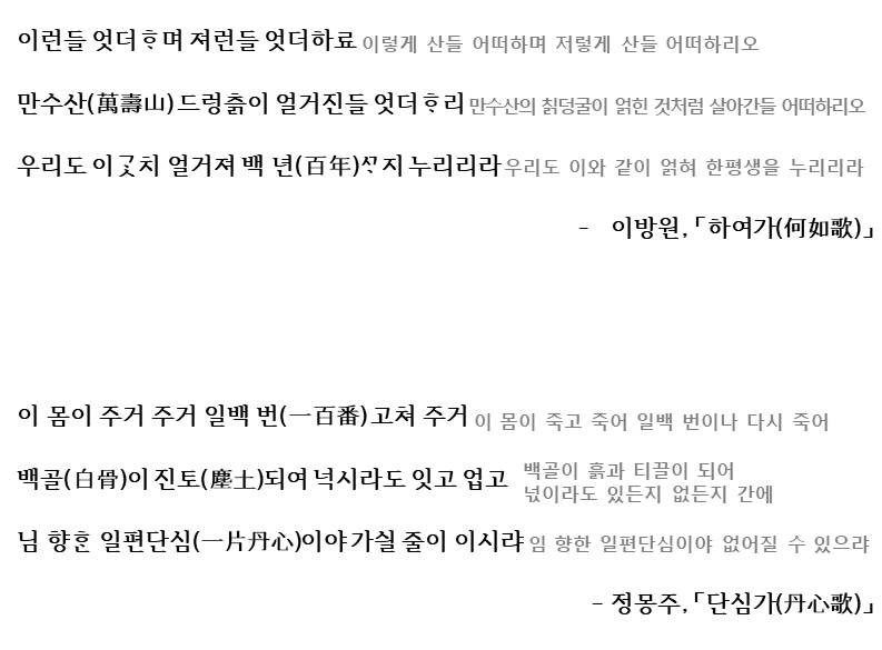이번에 다룰 작품은 이방원의 '하여가'와 정몽주의 '단심가'입니다. 이 두 작품은 고려말 조선을 건국하기위해 고려 신하들 중 핵심인 정몽주를 설득하기 위해 이방원이 그를 찾아가 이야기하며 주고 받은 것으로 유명한데요. 각각 어떤 의미를 가지고 있는지를 생각하며 작품을 감상한 후 해석을 통해 학습해보도록 합시다.