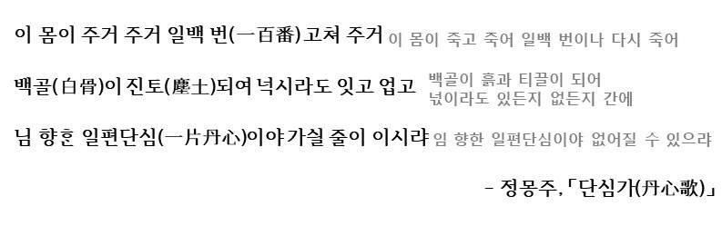 그것이 바로 단심가로 유명한 이 작품인데요. 이 몸이 죽고 죽어 일백 번 고쳐죽어 백골이 진토되어 넉시라도 잇고 업고라며 반복과 과장(일백번 죽을 수는 없죠), 점층(죽음-백골-풍화)을 통해 극한 상황은 상정한 후 그렇더라도 님(고려왕조) 향한 일편단심은 가실 줄이 있시랴며 의도적으로 질문(설의법)함으로써 고려왕조에 대한 변함없는 충성심을 드러내고 있습니다.